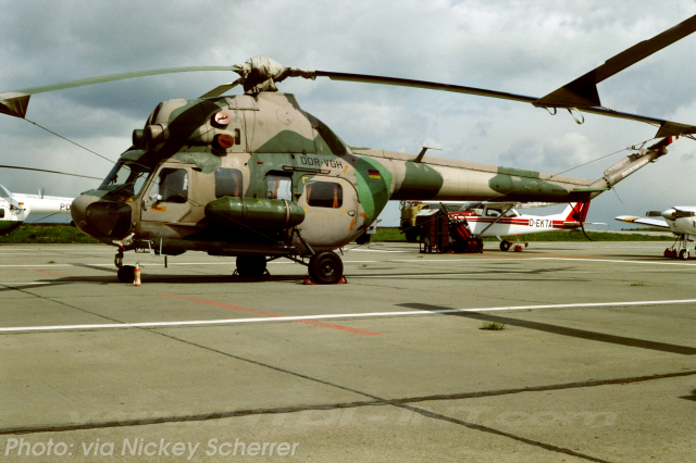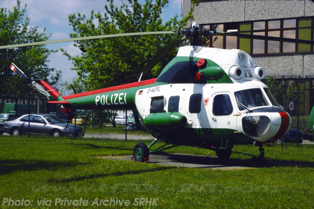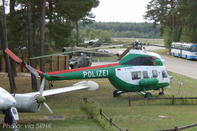 This helicopter was regd. in East Germany as NVA-322 to the HS 16 from August 985 till September 1990. Re regd. in East Germany to DDR-VGH by the ZPFlgStff from September 1990 till December 1992. Re regd. in Germany as D-HZPL to the Police of Th?ringen from December 1992 till September 1993. D-HZPL to the PHStff Bran from September 1993 till 2004. It was canx. as SOC and PWFU since 2004 and preserved as a gate guard next to the Police of Brandenburg main building at Sch?nefeld airport. Sold to private in an auction. The helicopter was transported to the Luftfahrthistorichen Sammlung Finowfurt (museum) and put on display there since 2005. Moved to Hangar 5 during 2008. Still there in June 2016!
